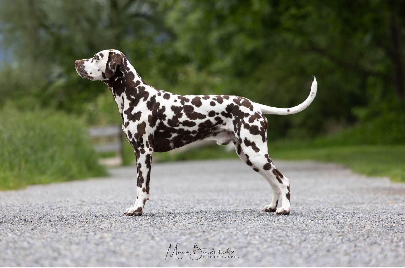 "Mocca" vereint genauso wie ihre Mutter "Indy" (Christi ORMOND Immortal Soul) kraftvolle Eleganz, Dynamik und Charisma! Sie ist eine völlig in der Balance und 100 % im richtigen Reckeckformat (10:9) stehende, harmonisch aufgebaute, sehr knochen- und ausdrucksstarke, kräftig bemuskeltete, athletische, elegante Hündin vom kleinerem Format mit einer hervorragenden Substanz und mit vorzüglich saftigem Pigment. Sie hat ein vorzüglich, typvolles Kopfmodell mit einem etwas kürzeren Fang mit teilweise pigmentierter Belefzung und einem durchpigmentiertem Augen- wie auch Nasensaum. "Mocca" hat mittel-bernsteinfarbende Augen sowie einen trockenen, edel aufgesetzten, langen Hals, der schwungvoll in den sehr gut ausgeprägten Widerrist übergeht und ein korrektes, vollständiges, kräftiges Scherengebiss. Sie verfügt über eine ausgesprochen vorzügliche Brusttiefe mit exzellenter Bemuskelung der Vorbrust und Schulter. Ihr Rücken ist gerade und fest mit einer vorzüglichen Kruppenlage, Ober- u. Unterlinie und einer vorzüglichen, leicht geschwungenen Rutenhaltung, ein vorzüglich und kräftig aufgeripptes Gebäude, mittelmäßig, runde, klar abgegrenzte, teilweise ineinander laufende Fleckung von vorzüglicher Größe. Ihre Gliedmaßen zeichnen sich aus durch eine vorzügliche Vorhand- und Hinterhandwinkelung mit einer geraden und kräftigen, leicht schrägen Schulter und runde, vorzüglich aufgeknöchelte Katzenpfoten. Sie hat einen ausgreifendes Gangwerk mit viel Schub. Zu ihren hervorstechensten, optischen Charismazügen gehört ihr typisches Dalmatiner lächeln, dass sie jedem sehr gerne zeigt. Ihre sehr schönen, etwas größeren, marmorierten Ohren, die korrekt angesetzt sind und getragen werden, runden ihr schönes, ausdruckstarkes Gesicht ab.